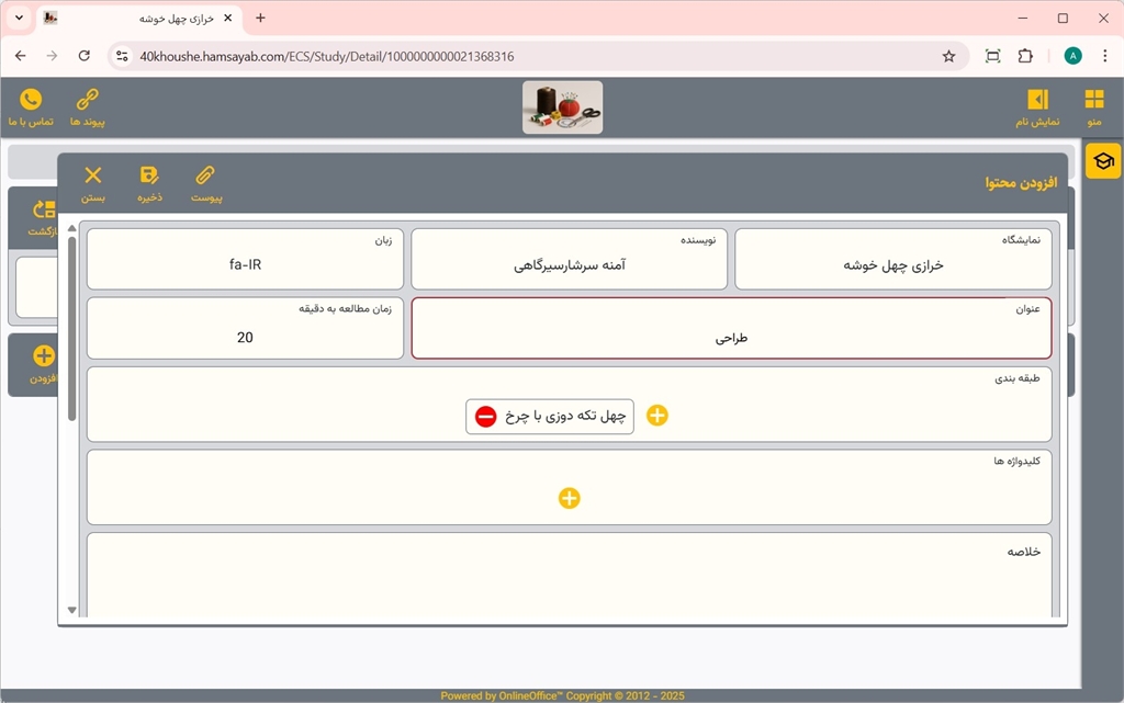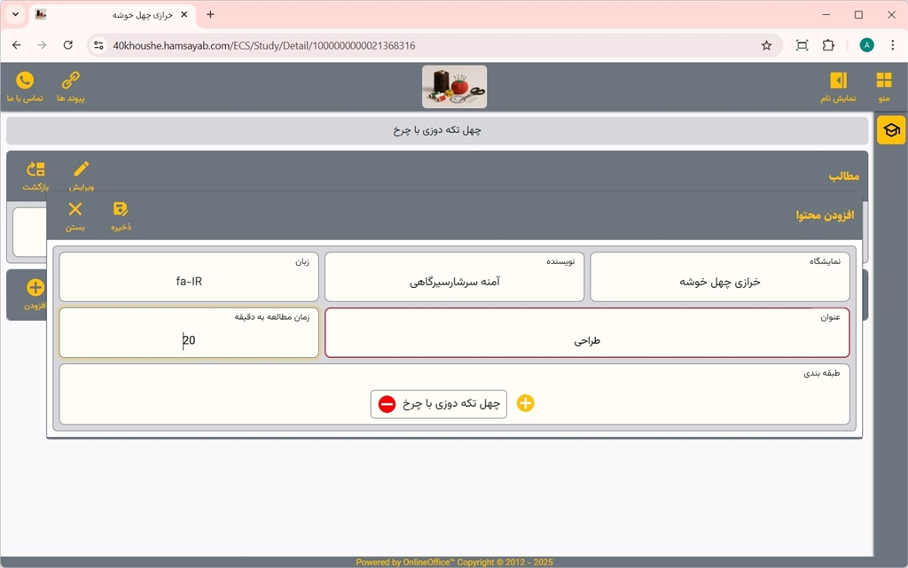 پس از ورود عنوان، زمان مطالعه به دقیقه و طبقهبندی های مورد نیاز محتوای مطالب آموزشی، بر روی دکمه ذخیره کلیک نمایید.