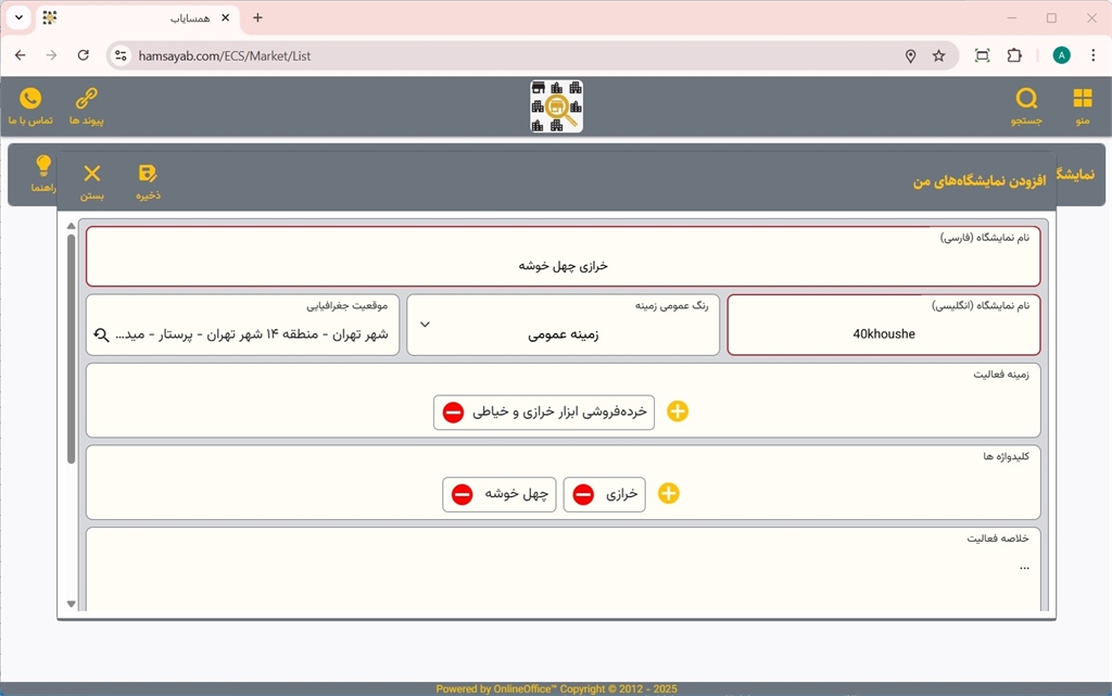 یک نام شامل ۴ تا ۳۲ حروف کوچک انگلیسی و اعداد را درنام نمایشگاه (انگلیسی) وارد نمایید، این نام به عنوان آدرس دسترسی به سایت پیش از hamsayab.com بکار گرفته می شود.
