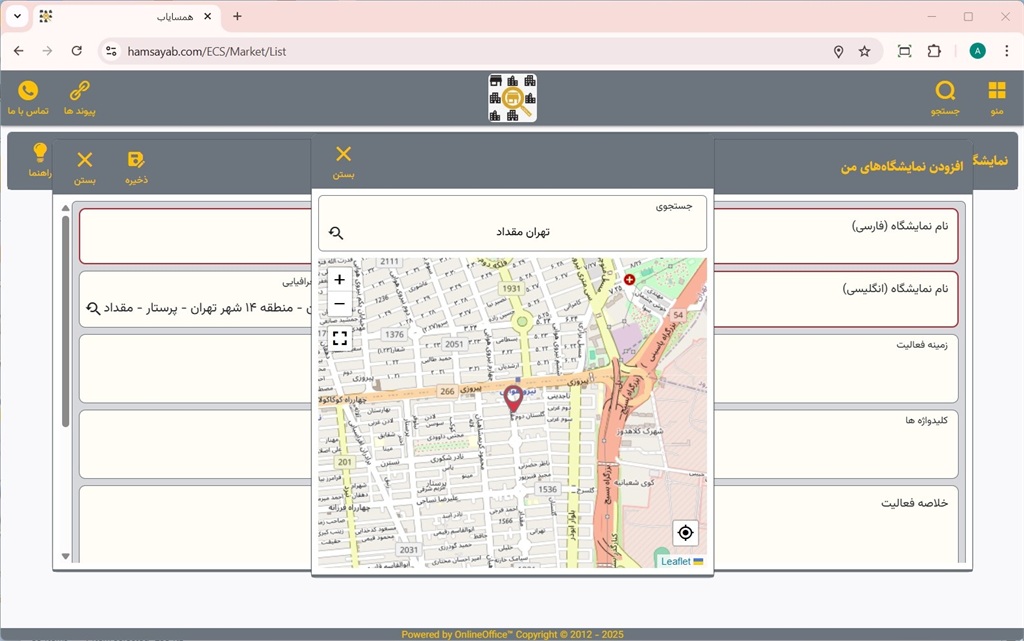 از روی نقشه موقعیت جغرافیایی را انتخاب نمایید. این موقعیت جغرافیایی، محل استقرار نمایشگاه را در جستجوهای کسب و کار و کالا میباشد.